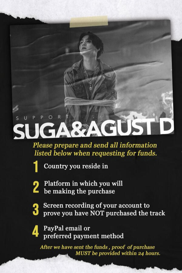 @SUGAFUNDSUPPORT is a funding account managed by the SUGA Publicist team (@dSUGA_1993 on X) dedicated to support SUGA and his artistry. To prepare for SUGA’s upcoming music releases, we are currently opening donations through the following options.All funds donated will be solely used to support SUGA and his projects, or as specified by the donor.